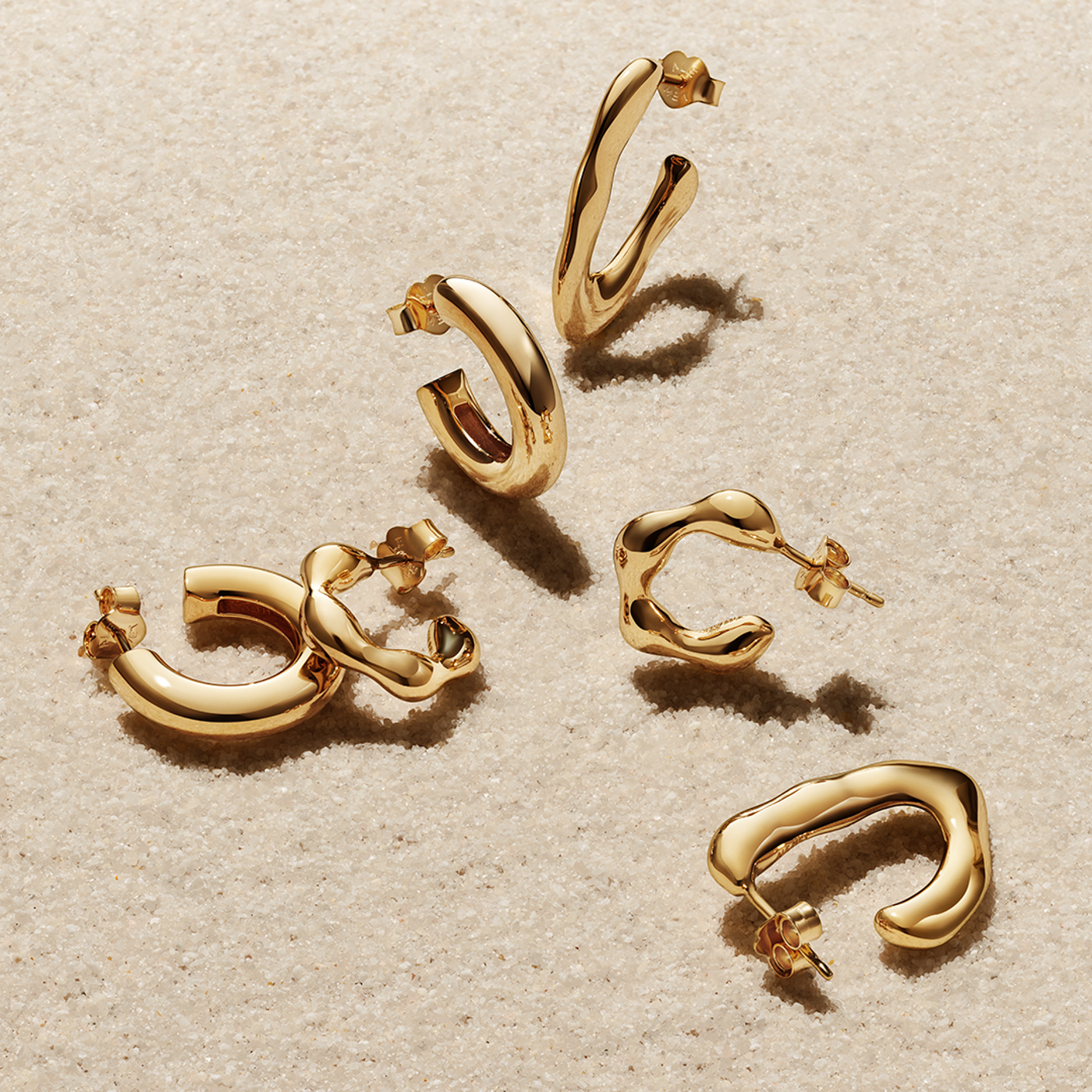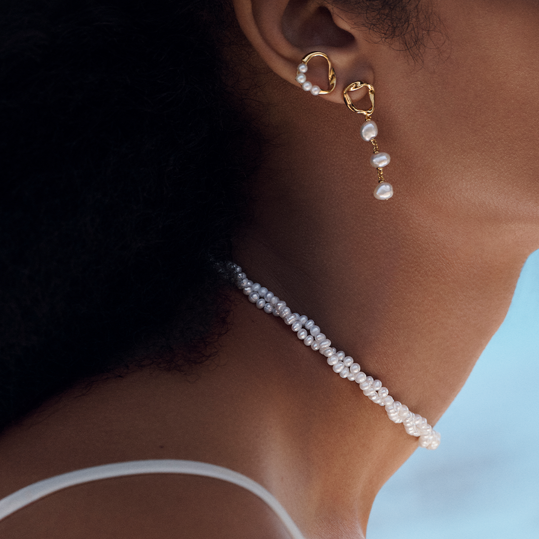 耳環設計也不乏亮點,有機尖角線條耳環圈以鍍14k金打造,呈現V字形尖角開圈設計,流麗如波浪的形態,令人聯想到大自然中的起伏流動。另一款有機圓形線條配巴洛克淡水養殖珍珠耳墜,飾以一顆獨特的巴洛克切面淡水養殖珍珠,展示了每顆珍珠的獨特性。