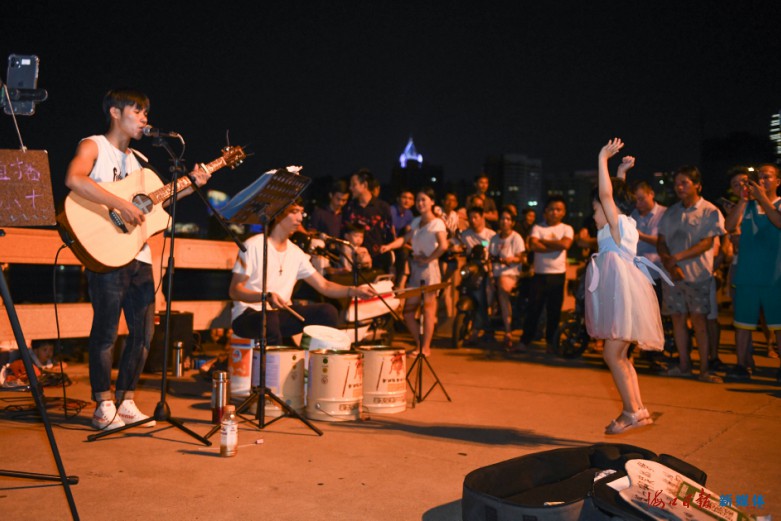 暮色四合,夕陽帶着最後的余暉沈入大海,海風吹拂下海口灣的街頭藝人以城市高樓和萬家燈火為背景,開始當晚的演唱,讓海口灣的夜晚充滿了詩意和活力。