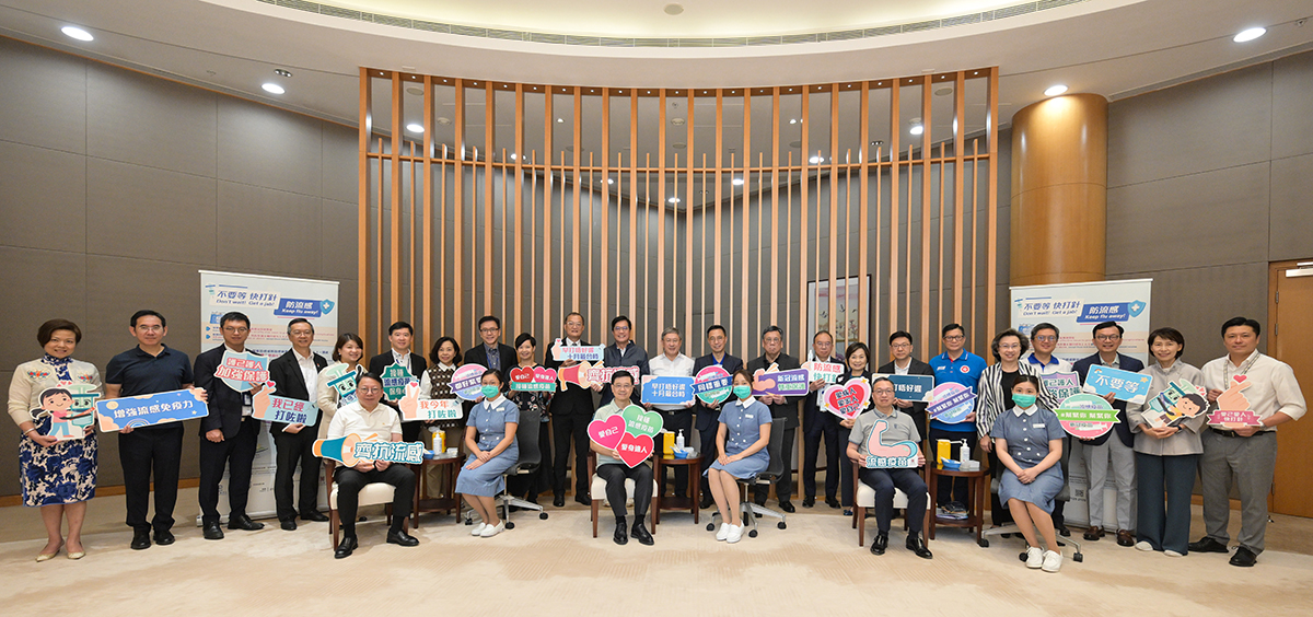 行政長官李家超(前排左三)、政務司司長陳國基(前排左一)、律政司司長林定國(前排右二)、政務司副司長卓永興(後排中)、財政司副司長黃偉綸(後排左十一),以及多名主要官員4日呼籲市民盡早接種季節性流感疫苗,以在冬季流感季節來臨前加強保護。(政府新聞處)
