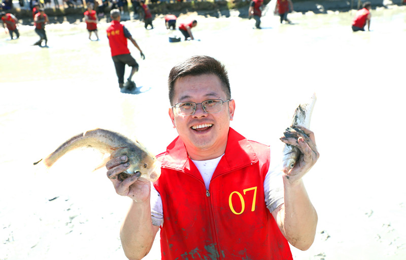 吉慶有魚,「摸」不完。伴隨一聲令下,「撲通,撲通……」競賽選手們相繼跳入池塘,水花四濺,大家在渾濁的泥水中摸索,主打一個「快、准、狠」,興奮感瞬間襲來,感受着魚兒從指縫間溜走的奇妙觸感。選手們和魚兒鬥智鬥勇,和時間賽跑,每一次捕捉成功都迎來一次勝利的歡呼。一時間抓魚者的驚呼聲、水花的迸濺聲、觀賽者的加油聲此起彼伏,歡聲笑語不斷,讓人慾罷不能。
