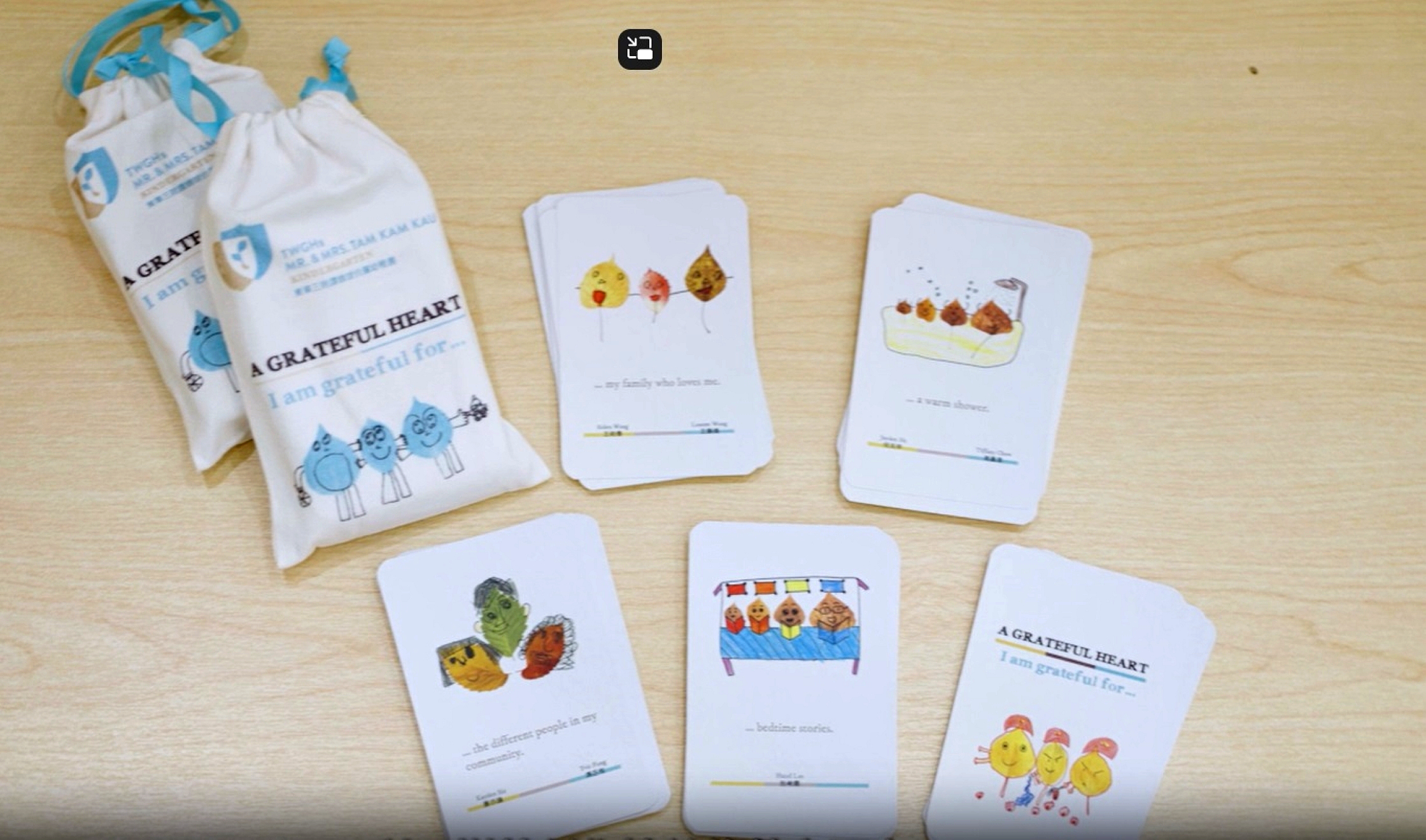 談校長稱,整套英語圖卡共有60張,當中48張由學生設計,另外有12張有樹葉拼砌的白卡,供學生自己創作和寫下感恩句子,贈予其他人。她表示今年希望在品德教育方面落墨,故以「感恩」為主題,並以大自然中的樹葉拼砌畫作,讓學生發揮創意,表達不同感恩的事。