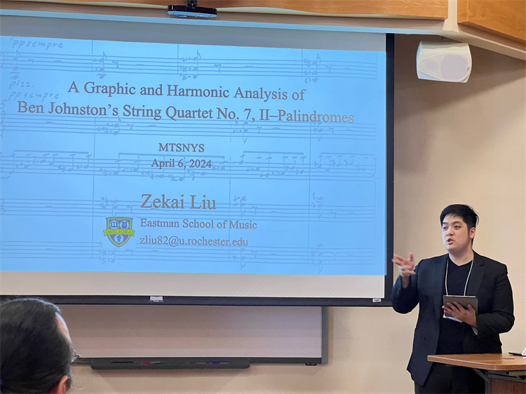 頂圖圖說:2024年美國紐約州MTSNYS的年度會議上,劉澤鍇學術演講時美國伊斯曼音樂學院派出的教授團隊助威。