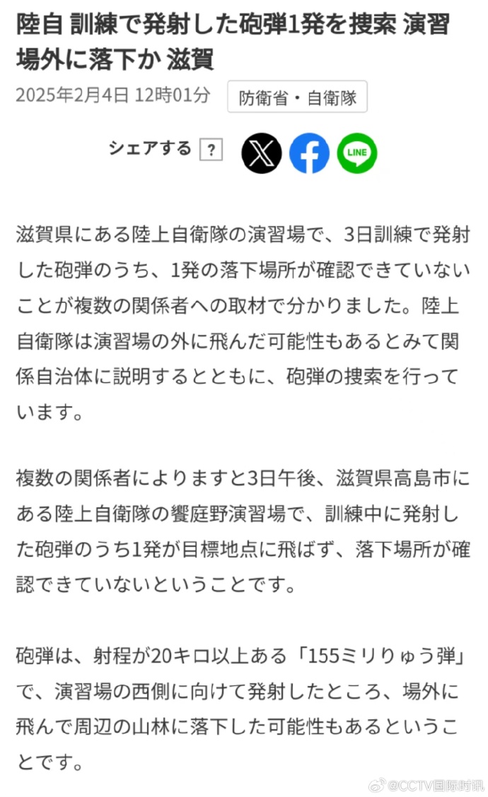 據日本廣播協會(NHK)今天(2月4日)報道,據多名相關人士透露,3日下午,日本陸上自衛隊在滋賀縣高島市的饗庭野演習場進行訓練時,有一枚炮彈沒有準確飛向目標地點,但未能確認到落點。據報道,炮彈可能飛出了演習場範圍,落於周邊山林中。陸上自衛隊正在向有關地方政府作出說明並展開搜索。據報道,目前沒有收到人員受傷的報告,陸上自衛隊於該訓練場的射擊訓練已暫停。2018年和2021年,饗庭野演習場也曾發生炮彈落於訓練場外的事故。