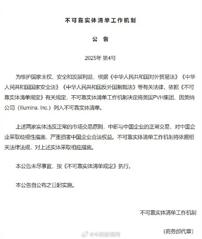 新華社北京2月4日電 不可靠實體清單工作機制4日發布公告,決定將美國PVH集團、因美納公司(Illumina, Inc.)列入不可靠實體清單。