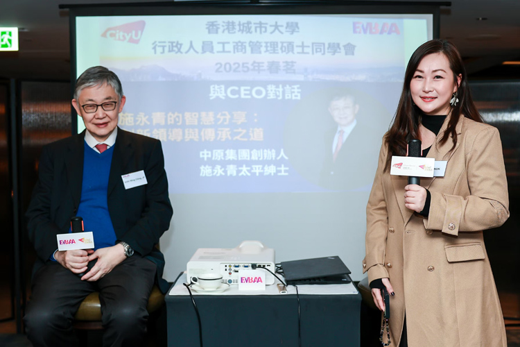 香港城市大學(城大)行政人員工商管理碩士同學會(EMBAA)日前假中環銀行家會所設新春晚宴,適逢同學會成立25周年舉辦與CEO對話分享會,主題是「創新領導與傳承之道」,邀請中原集團創辦人施永青博士太平紳士擔任分享嘉賓。