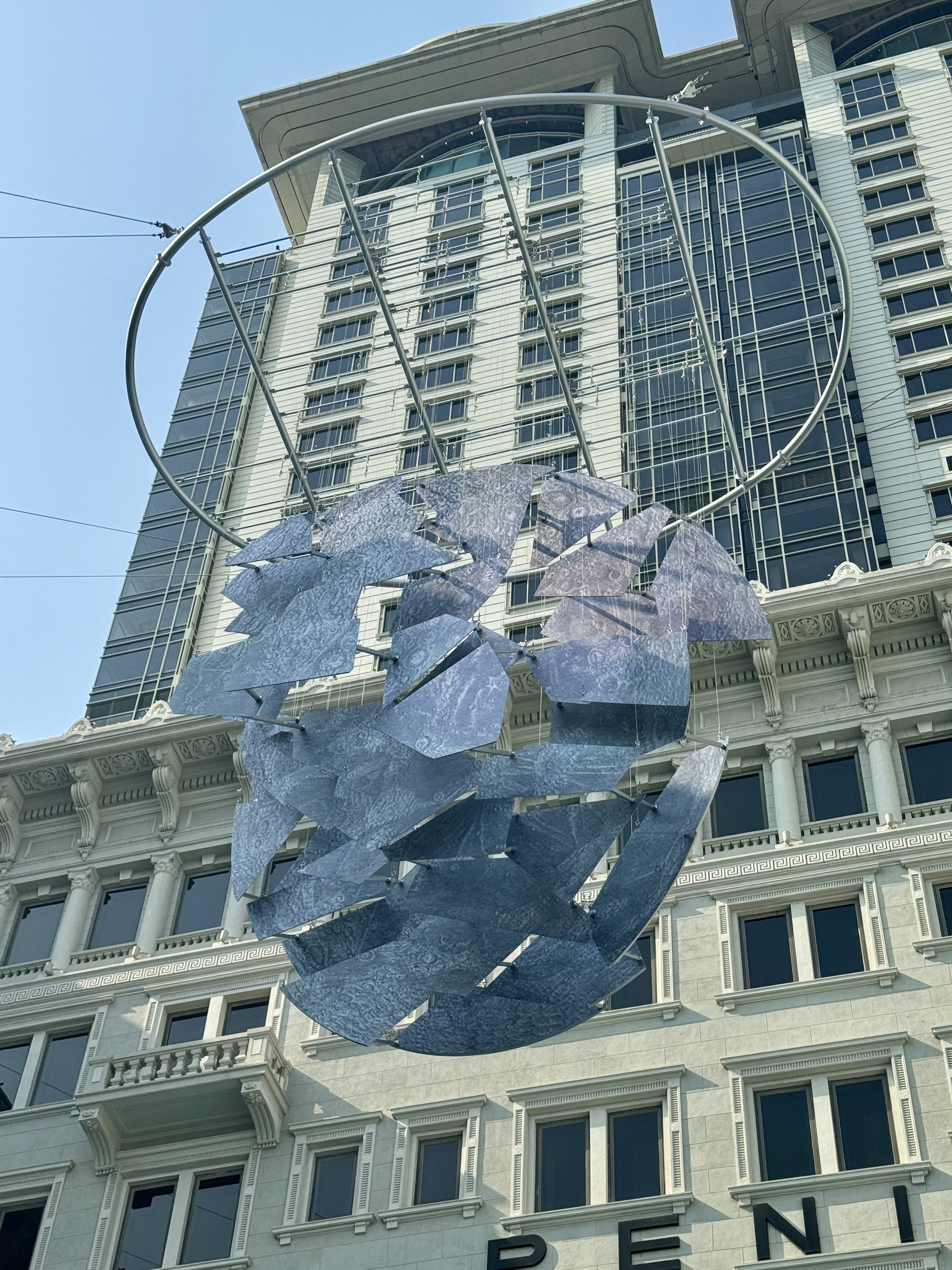 走到大堂茶座入口處,設有由維多利亞與艾爾伯特博物館亞洲部策展人李曉欣策劃、內地織品藝術家林芳璐創作的《她給予的愛》(She's Bestowed Love)。這件大型作品透過鮮紅色的雕塑,歌頌女性的強大和力量。林芳璐指出,作品的創作靈感源自雲南少數民族堅韌的白族婦女及其世代相傳的傳統織品工藝。這件作品隨後將移師到位於倫敦南肯辛頓區的維多利亞與艾爾伯特博物館,作為今年秋季開幕為期一年的「Dimensions: Chinese Contemporary Studio Crafts」的標誌作品。