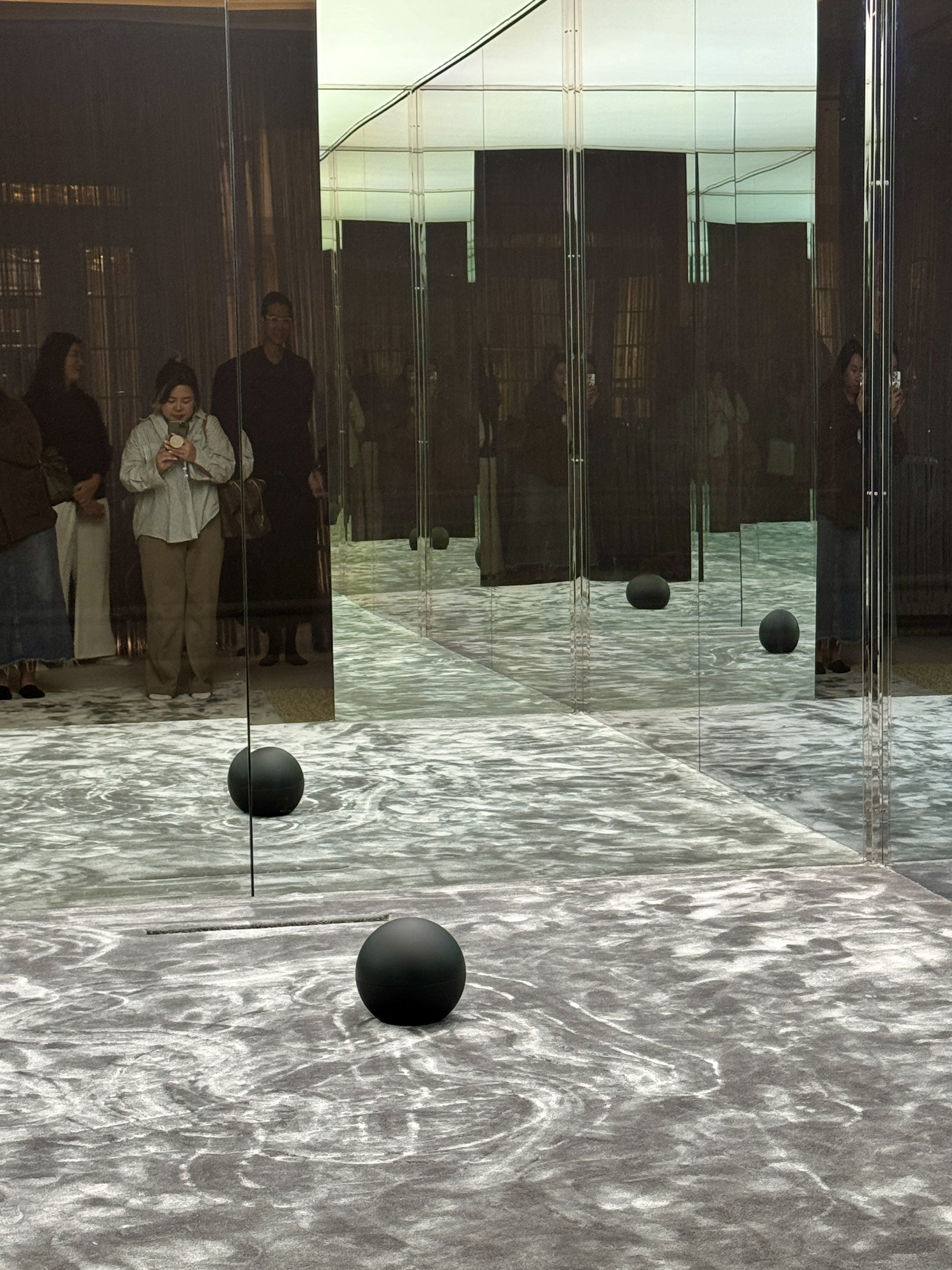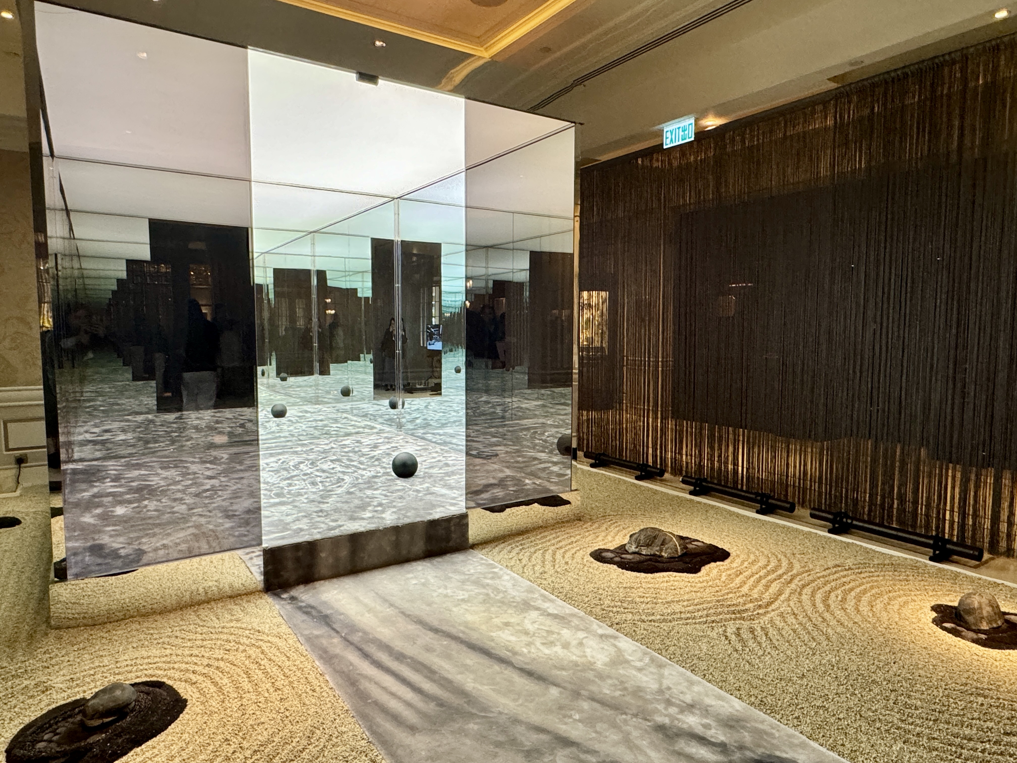 至於第三件作品,則在酒店一樓的露台餐廳展出。作品由香港新媒體藝術家張瀚謙與太平地氈合作的《識心亭》(The Flow Pavilion)。這座恍如現代茶室的單向玻璃屋坐落於禪宗花園中,邀請參觀人士脫下鞋履、進入小屋,開展聯繫自我的寧謐之旅。走入玻璃屋內可坐在地氈上,地上有一顆裝有設計程式的移動球體,參觀者可集中精神欣賞,恍如進入「入定」狀態,透過現代科技帶來冥想體驗。