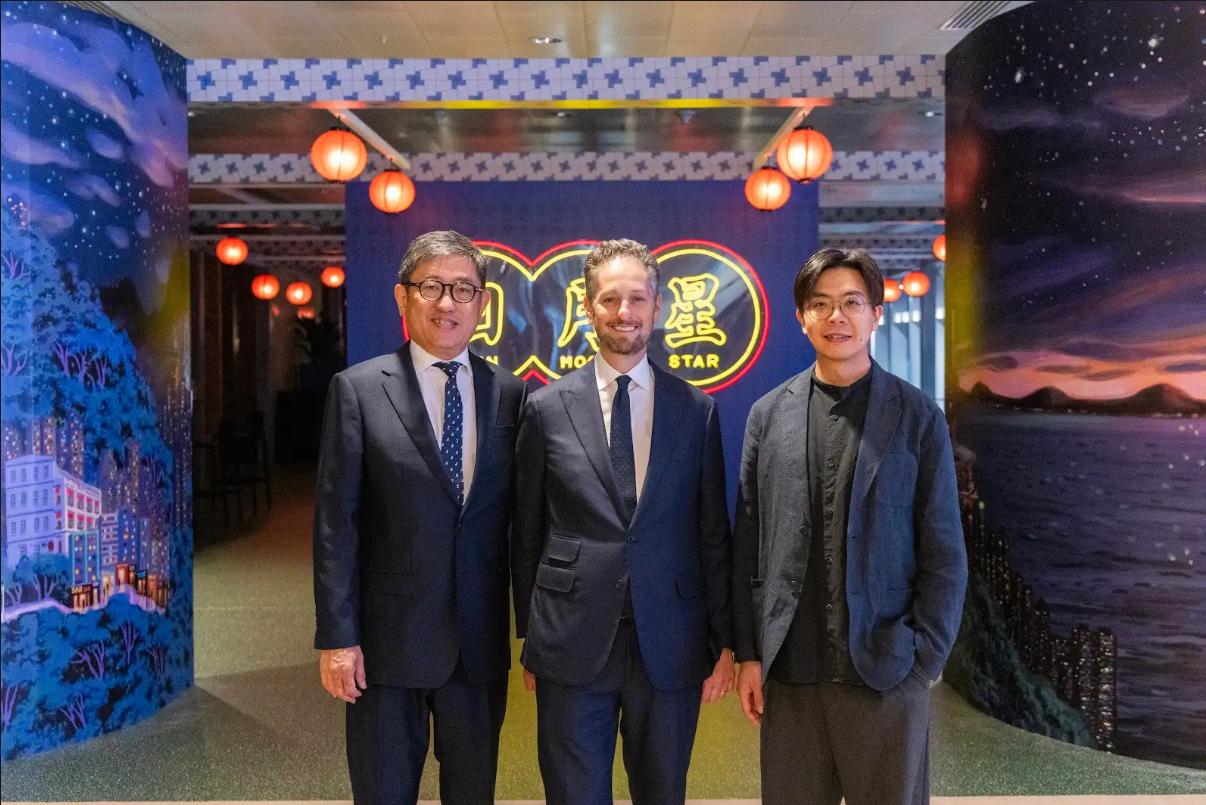 香港旅遊發展局總幹事程鼎一、Art Basel行政總裁Noah Horowitz及本地藝術家黃進曦參觀「日月星」酒吧。