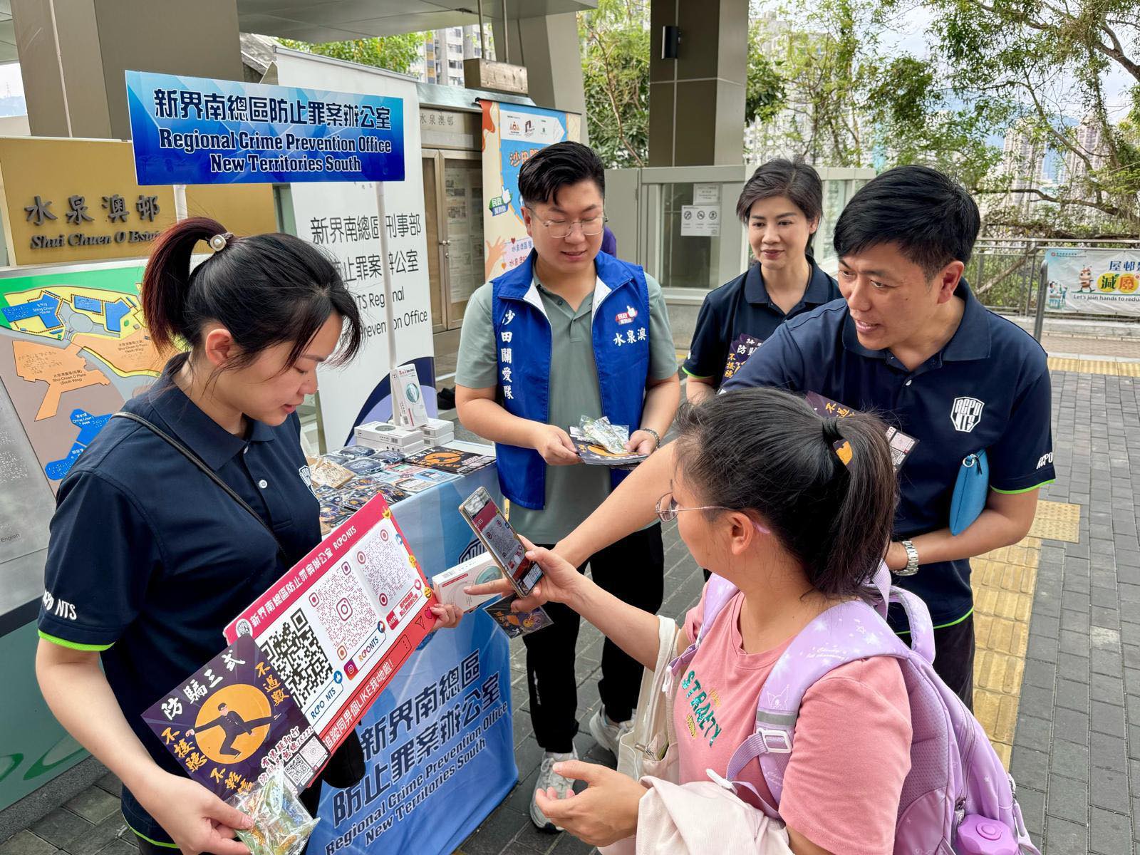 為繼續發揮「警民攜手齊防騙」的協同效應,新界南總區防止罪案辦公室於過去一星期聯同警區代表、地區關愛隊及區議員,於葵青、沙田、荃灣及大嶼山內的公共屋邨熱門人流出沒地方設立「屋邨防罪資訊站」,與居民交流時下最新的騙案類型和手法,分享實用防騙訊息和心得,並派發防騙日用品,將防騙資訊融入家中。