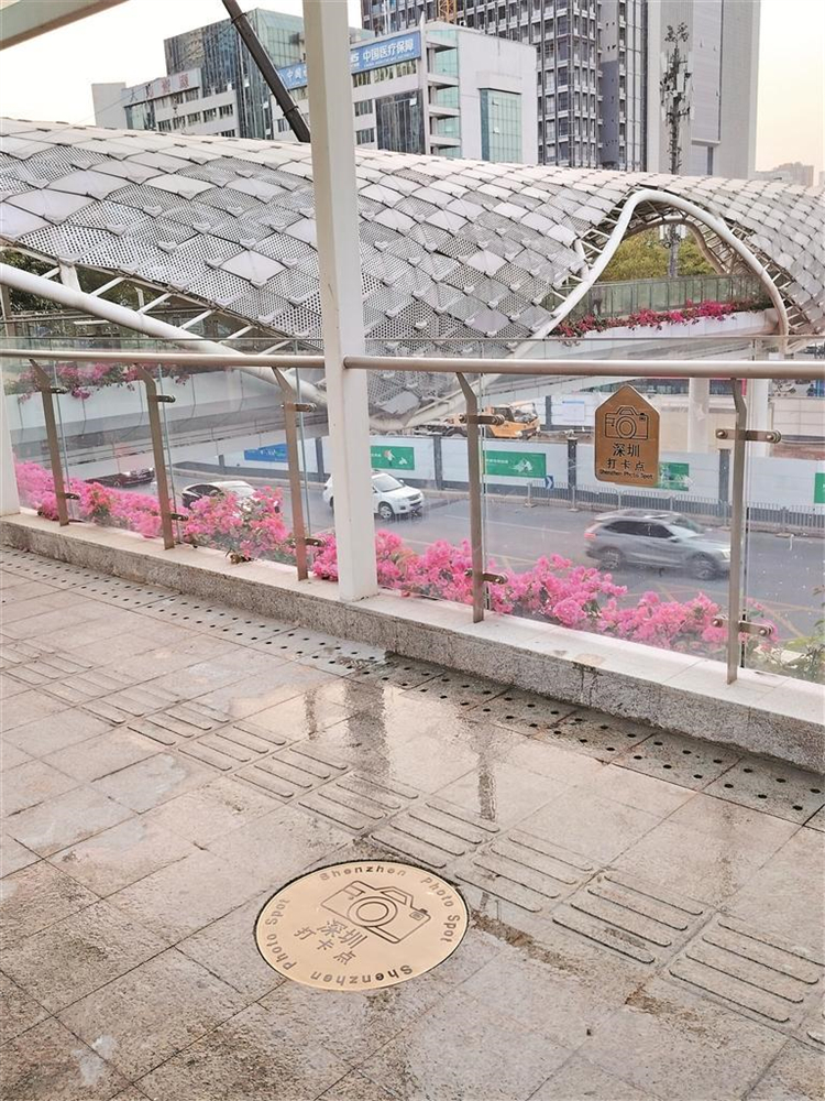 兩個點位均通過藍色地面標線劃定專屬拍照區,配套設立「深圳打卡點」立體標識,在幫助市民快速定位目標地點的同時,也可引導市民在指定範圍內拍照活動,減少對交通和行人的干擾。打卡點標識設計有圓形嵌地和附着式兩種樣式,採用黃銅材質,內圈附帶相機圖案和深圳打卡點中英雙語字樣。