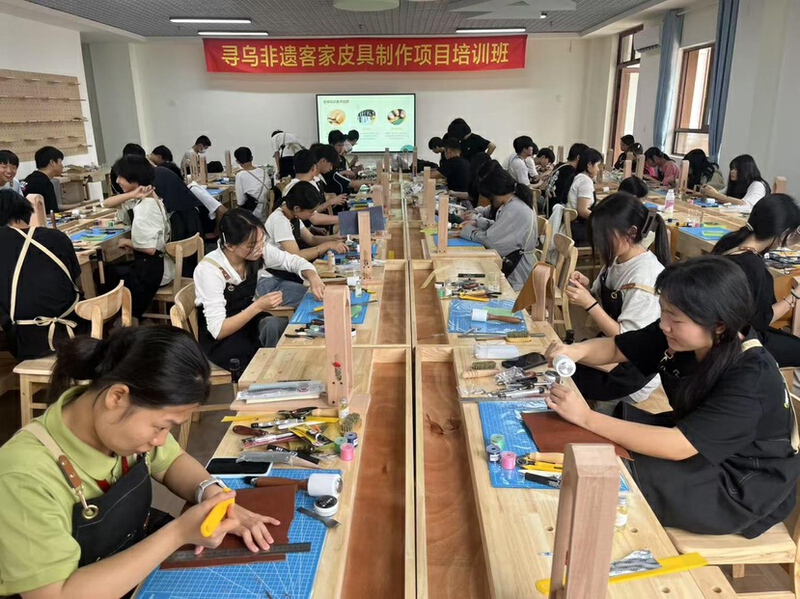 5月6日,在尋烏縣「幸福小鎮」,寬敞明亮的教室里洋溢着新生向上的興奮氣氛,「深尋非遺工坊」木雕工坊、皮具製作工坊正式開班。這兩家工坊分別以尋烏當地的「客家木雕」技藝和「皮具製造工藝」 為依託,由非遺傳承人何坤、劉啟深主持。每間工坊計劃培訓50名左右從業者,通過為期一個月的系統培訓,不僅教授基本的非遺技藝,還提供產品設計、品牌推廣、產品銷售等全方位幫助,旨在讓學員們在培訓結束後能夠自主生產、銷售創新產品及文創產品,實現獨立生產或在非遺工坊就業,着力培養一批以非遺技藝為創新創業手段的 「新農人」。