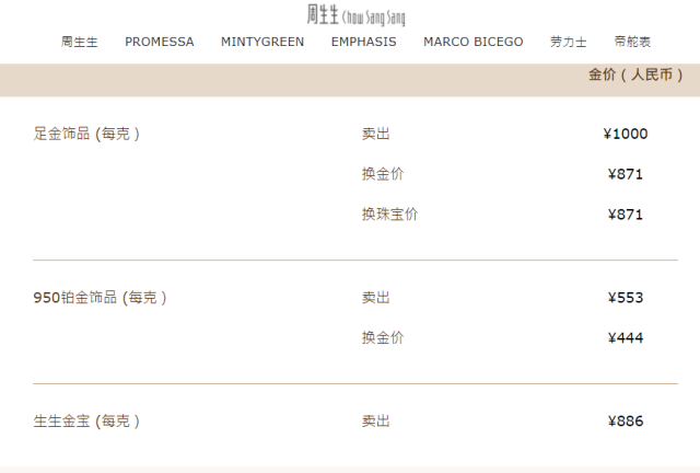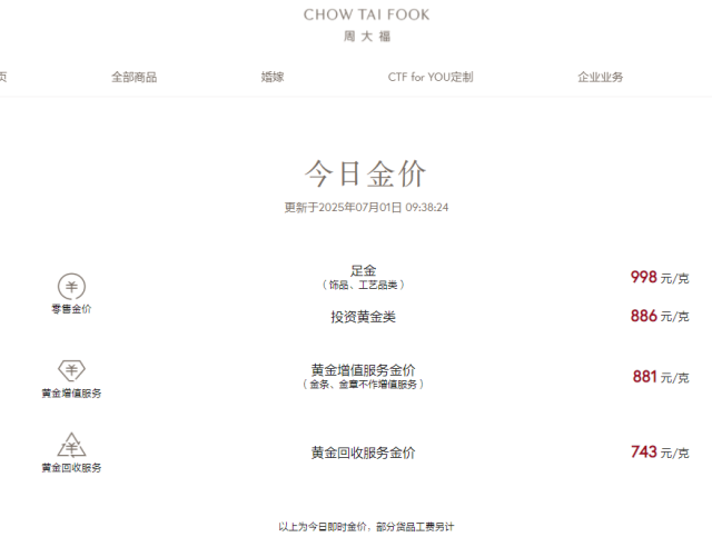 受此影響,國內黃金品牌價格隨之攀升,克價紛紛漲至千元左右。中新經緯7月1日查詢發現,周生生足金飾品報價為1000元/克,較前一日每克上漲15元;老鳳祥金飾價格為999元,較前一日上漲12元;老廟黃金足金飾品報價為995元/克,較前一日每克上漲11元;周大福金飾報價為998元/克,較前一日上漲9元。