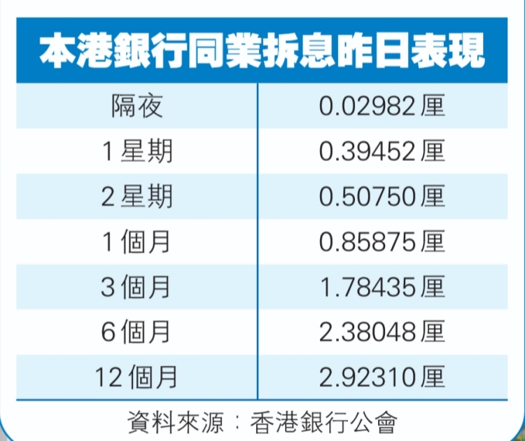另外,香港銀行同業拆息(HIBOR)周五全線回升。據香港銀行公會資料顯示,與樓按相關的1個月HIBOR報0.85875厘,升14.63點子,但仍低於上周四(6月26日)的0.96554厘。至於反映銀行資金成本的3個月HIBOR,報1.78435厘,升8.4點子。