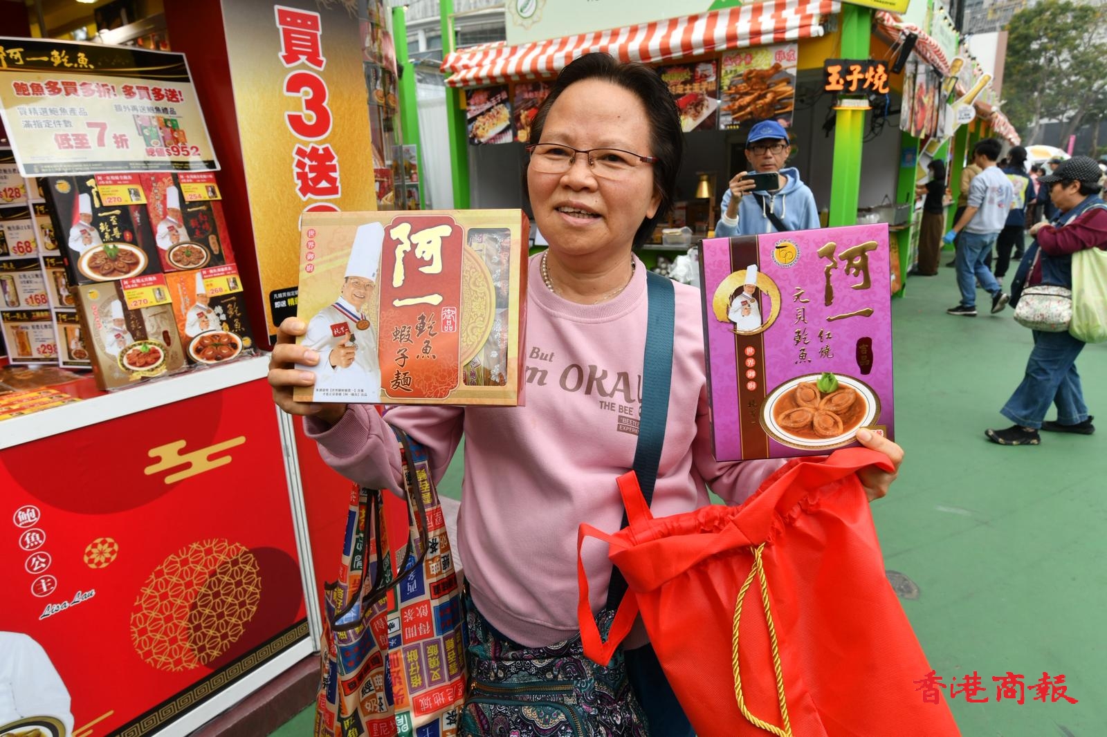 有來自沙田的萬先生與2名「老友記」一起來辦年貨,買了5000元鮑魚冬姑海味。他說:「今天雖然帶了車仔來,但明天還要來再買,展期內會來多幾次,反正我們是長者車費、入場又不用錢,來這裏可以玩一天,在展會試食又可以當午餐。」