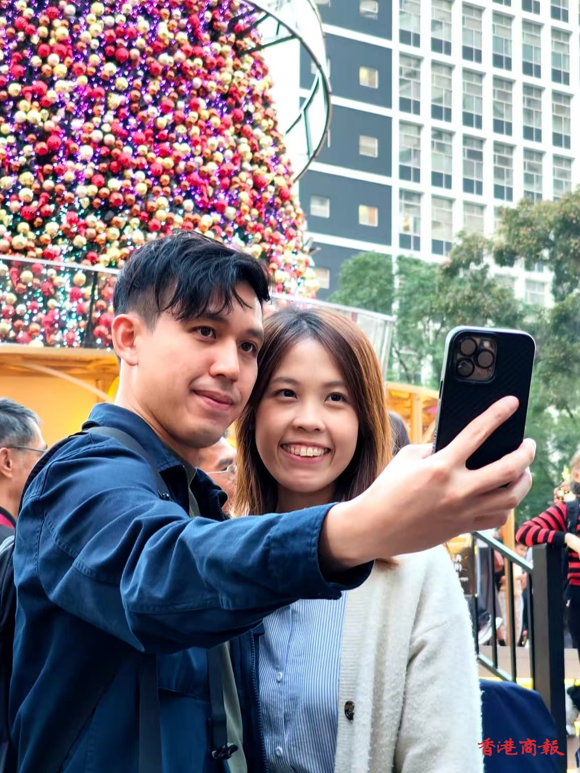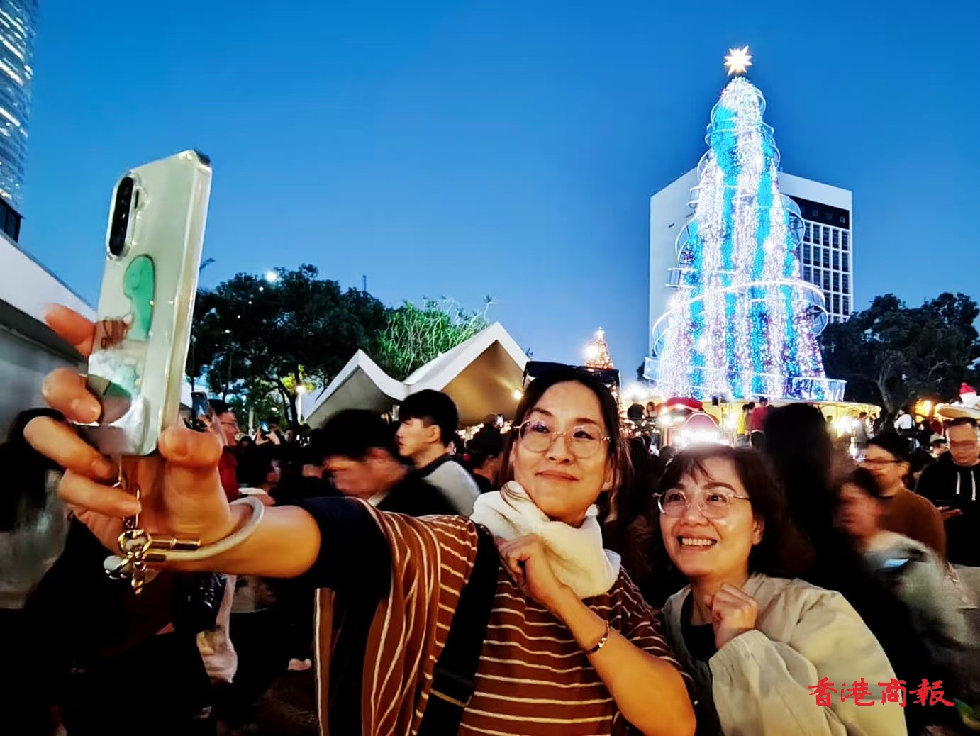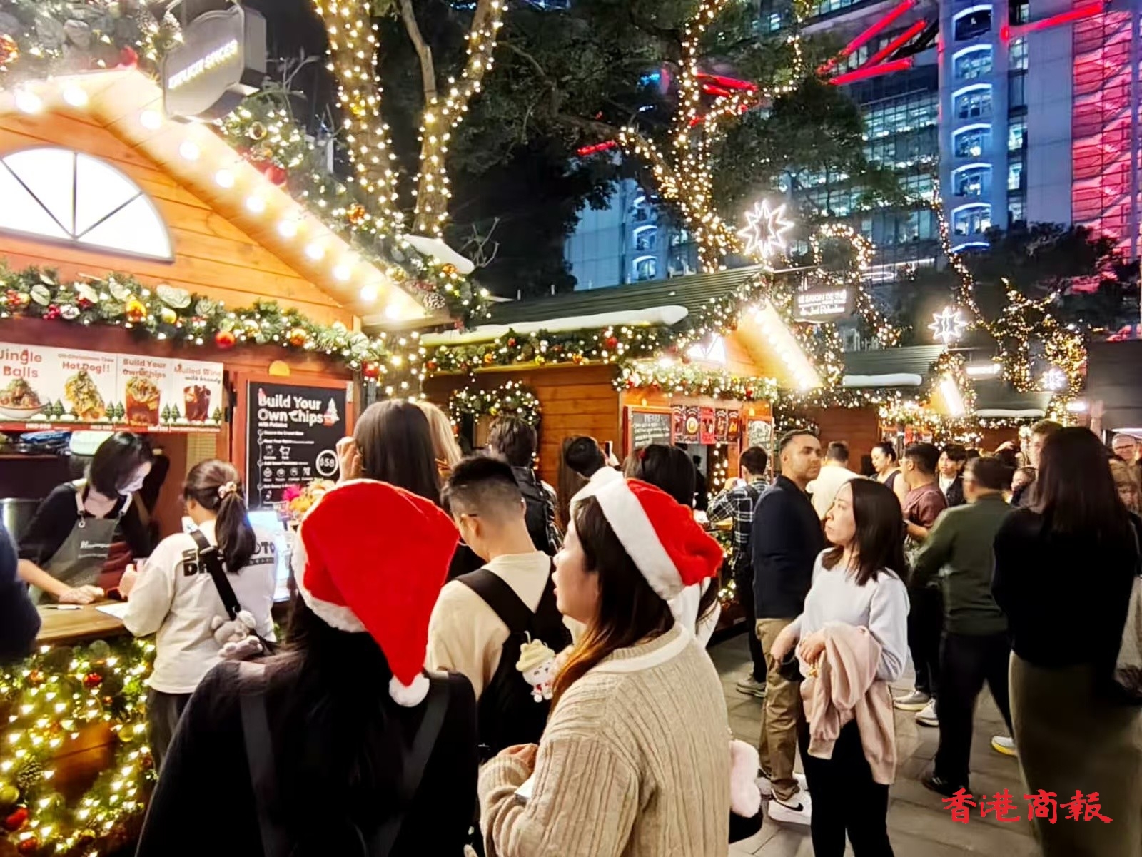 明天是聖誕節,全港各區的聖誕燈飾已經亮起,吸引不少市民、遊客趁今晚(24日)平安夜提前出門感受節日氣氛。在中環的冬日小鎮,傍晚起已人山人海,有一家人齊出行,亦有情侶約會、好友相約,大家紛紛圍在巨大的聖誕樹周圍,尋找最佳打卡位,場面熱鬧又溫馨。(記者馮瀚文攝)