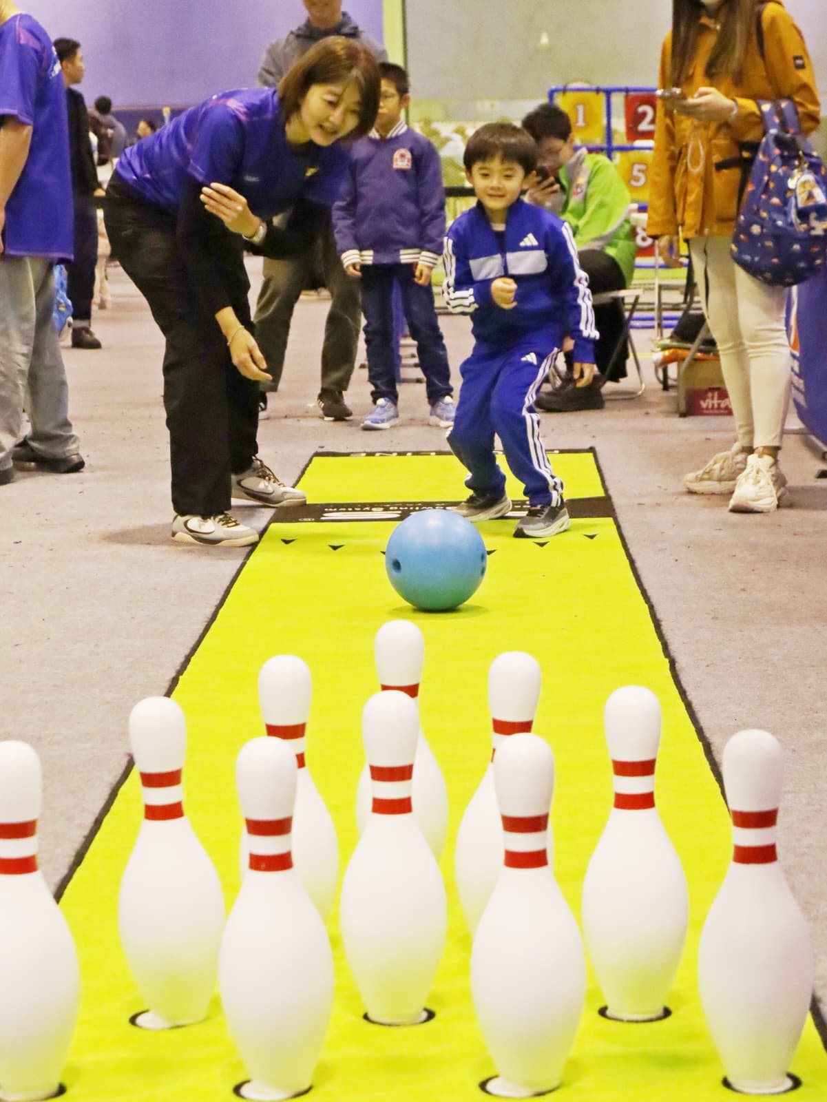 小孩子試玩保齡球。
