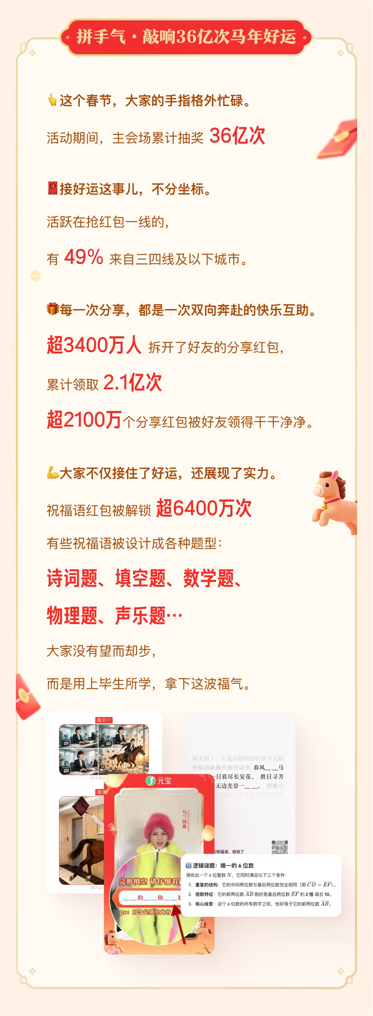 蹲口令、猜口令、造口令,祝福語紅包被網友玩出了花。16天裏,祝福語紅包被成功解鎖超6400萬次。從「馬」字詞語到完形填空、詩詞默寫、聲樂題、數學物理題,各種花式題型為網友搶紅包增添更多歡樂,甚至不少網友為了紅包徹底放下包袱:對着元寶唱《套馬杆》、喊 「駕駕駕」解鎖語音口令紅包。不知何時,網友的自創祝福語也開始全網瘋傳,"馬冬梅"、"馬保國"、"馬應龍"等天「馬」行空的「假口令」為這次紅包活動帶來意外的驚喜與樂趣。