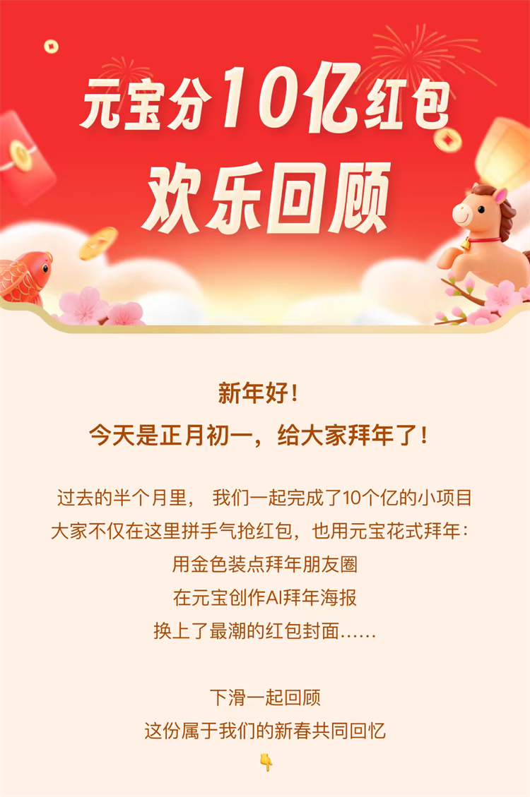 從做任務抽紅包到絞盡腦汁猜口令,有人把分享紅包撒向全網,也有人為了小馬卡各顯神通,有人用金色裝點拜年朋友圈,也有人在元寶創作AI拜年海報、換上最潮的紅包封面……10億現金紅包活動告一段落,但是半個月「AI+紅包」妙趣玩法帶來的歡樂故事,正成為網友們馬年新春的共同回憶。(記者 沛菡)