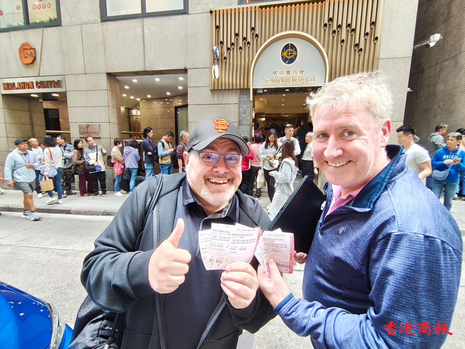 來自荃灣的候先生表示,如果中了大獎,會首先會買樓,之後做善事,再之後是旅遊。 來自新界的盧女士說:「今日是大年初五,想行下大運,所以專程出來買六合彩,今次會買3張電腦飛。」 頂圖:開出最多頭獎次數的中環士丹利街投注站,今天中午有逾600人排隊,平均須要排3個小時隊才能買到彩票。