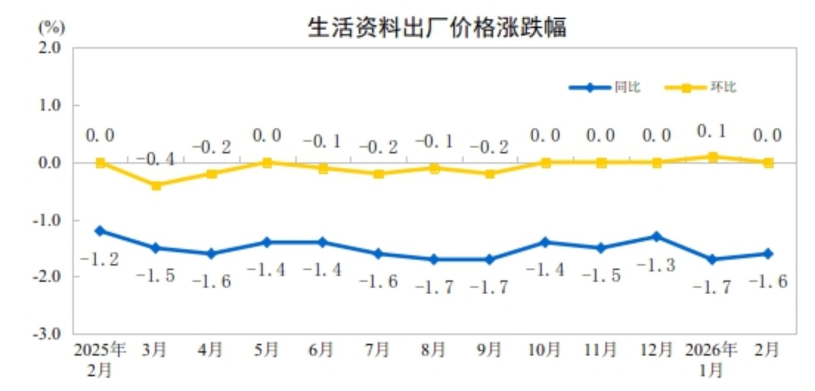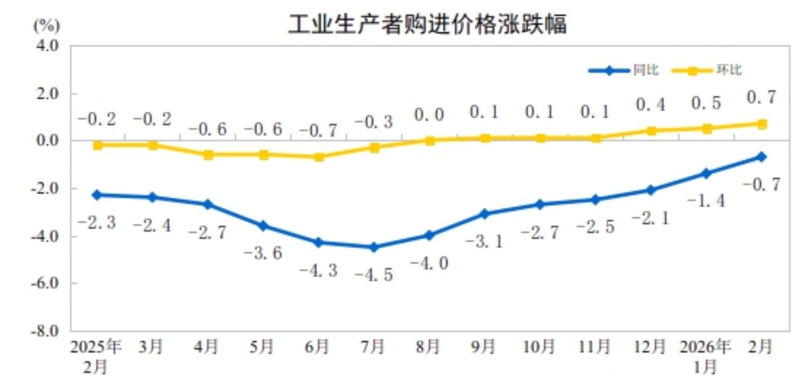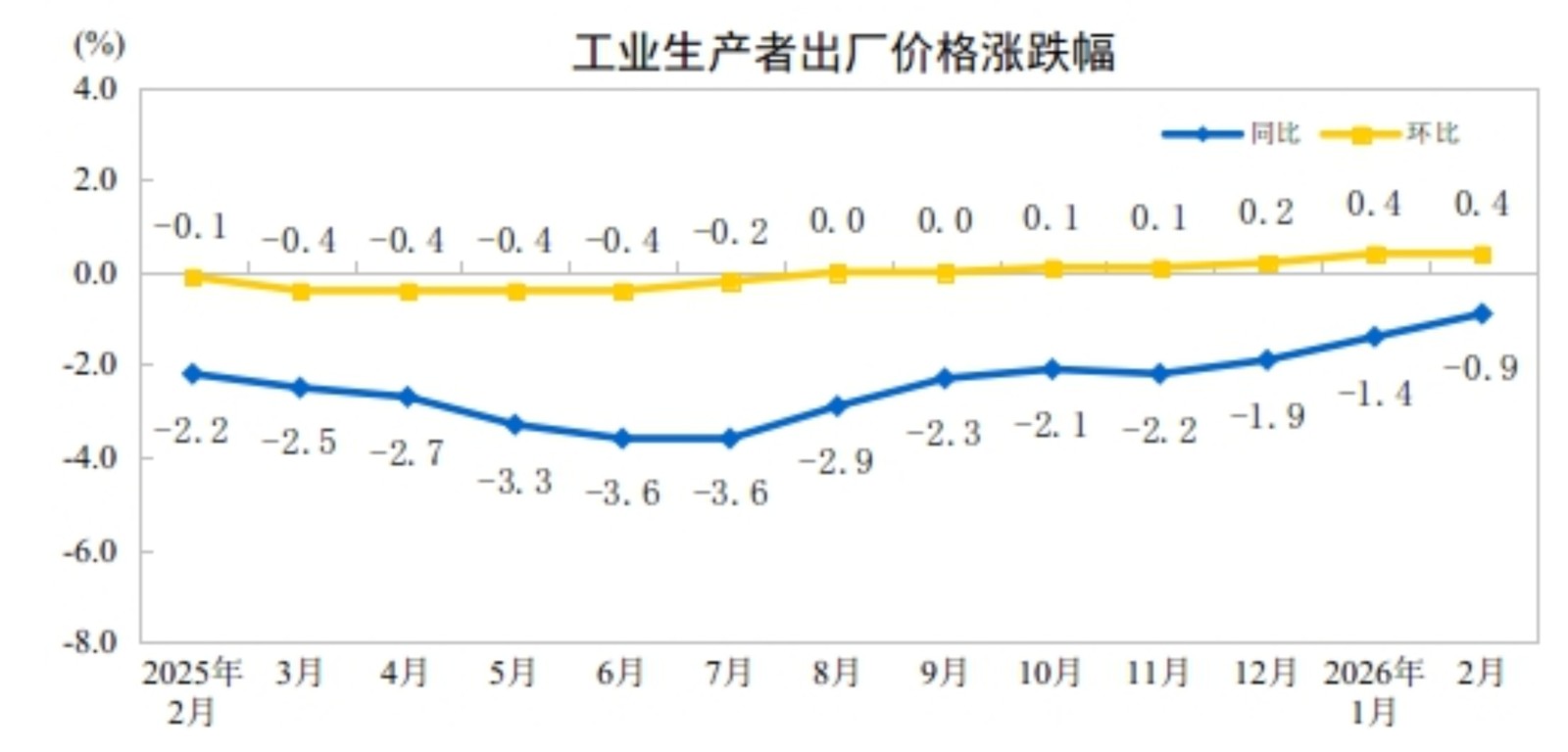 據國家統計局網站9日消息,2026年2月份,全國工業生產者出廠價格同比下降0.9%,降幅比上月收窄0.5個百分點;環比上漲0.4%,漲幅與上月相同。工業生產者購進價格同比下降0.7%,降幅比上月收窄0.7個百分點;環比上漲0.7%,漲幅比上月擴大0.2個百分點。1—2月平均,工業生產者出廠價格比上年同期下降1.2%,工業生產者購進價格下降1.1%。