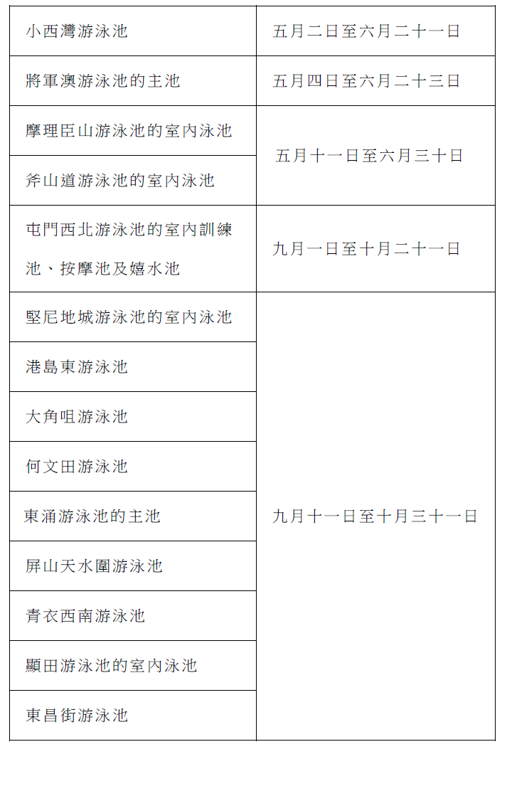 至於同時設有暖水及非暖水游泳設施的19個泳館,暖水游泳設施於4月1日至15日會繼續開放,而非暖水游泳設施則於4月16日起開放。