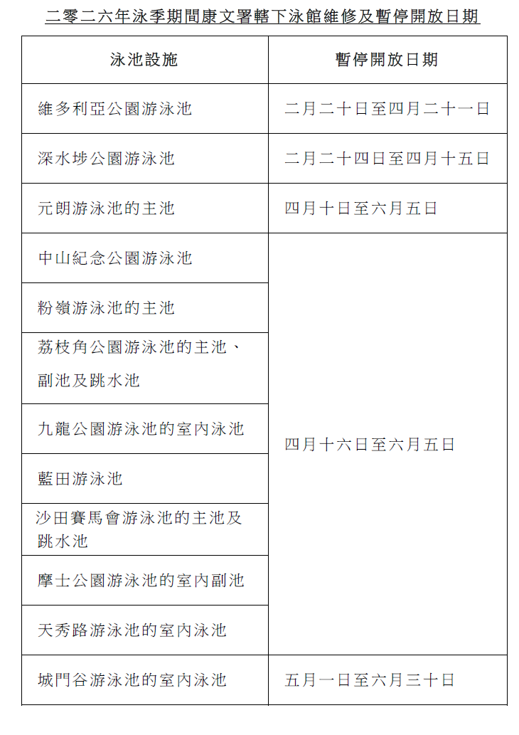 3月31日,康樂及文化事務署(康文署)宣布,轄下44個泳館4月1日開放,供市民在新泳季暢泳。個別公眾游泳池於2026年部分日子暫停開放以進行維修工程。市民在享受游泳樂趣之餘,要注意安全、顧己及人,保持公眾泳池清潔衞生。