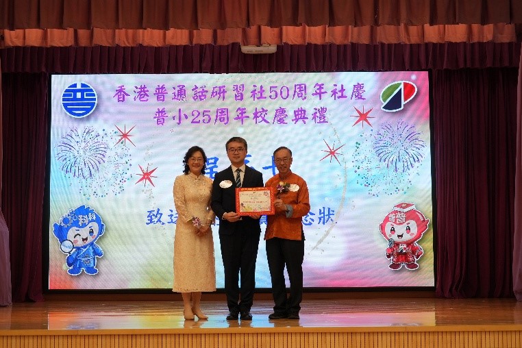 香港普通話研習社科技創意小學陶群眷校長在典禮分享互動中,更深信家長是重要夥伴,家教會多年來積極參與校務及社區服務,屢獲「傑出義工團體」及「社會資本動力大獎」等嘉許,充分體現「家‧社‧校」協作精神。陶校長認為金禧社慶、銀禧校慶既是總結成果的重要時刻,更是邁向新里程的起點。該校將進一步深化AI元素於各科教學中的應用,同時引入智能行政系統,提升管理效能,讓該校老師可以更專注於教學工作與培育學生。陶校長最後總結,未來該校將繼續秉持優質教育理念,結合語文優勢與科技創新,培育具備品德修養、創意思維及國際視野的優秀人才,為國家及香港教育發展貢獻力量。