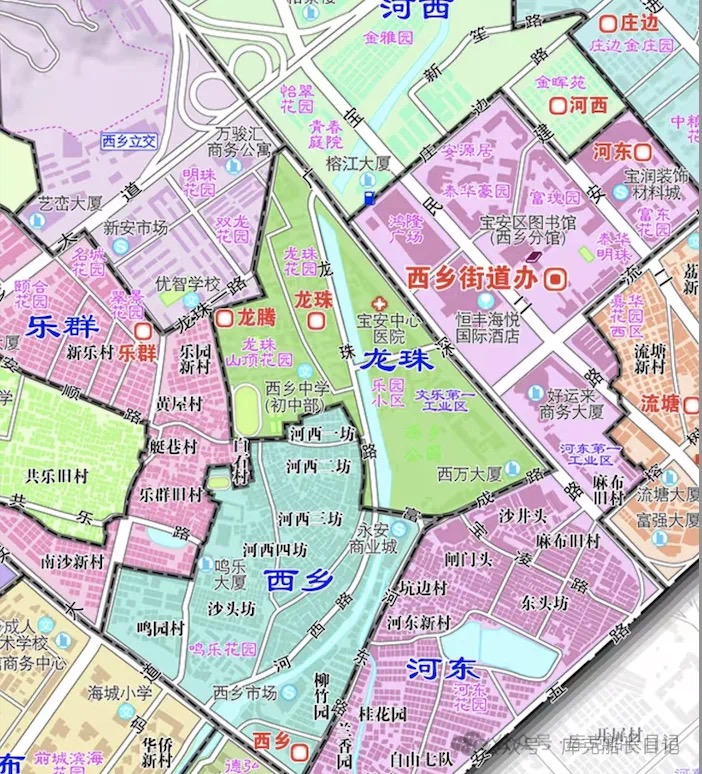 西鄉牌坊在西鄉公園往東走,國道邊。還是寶安日報社劉傑給我的高清電子版《西鄉街道行政區域分布圖》有用:西鄉公園、西鄉醫院、荔園路以北三角地,及河西西鄉中學初中部、龍騰龍珠,屬於龍珠社區,也就是龍珠山頂花園、龍珠花園至公園之地。目前河東社區以107國道為界,且其東端是麻布舊村。目前劃在河東社區的有:東頭坊、河東新村、閘門頭、坑邊村、沙井頭、桂花園、蘭香園、自由七隊、徑貝飯堂門等。正對河西是西鄉社區,跨到河東之西鄉村(西鄉市場、基督教西鄉堂)、柳竹園,在河西有鳴園村、沙頭坊、河西四坊、河西三坊、河西二坊、河西一坊。一坊近崗,在山頂花園下,是否最為古老。西鄉村朝向哪裏?內伶仃,還是小南山。古之河西大概即此五坊,王大中丞祠在四坊南、沙頭坊東,北帝廟在二坊、三坊間。西是樂群社區:黃屋村、艇巷村、樂群舊村、白石村、南沙新村,北邊有新樂村。河東之開屏村在新安五路東劃入新安街道,與翻身交界處有河東第二工業區。目前叫作河西社區的:全部是新住宅或拆遷空地,有河西金暉苑,與在寶潤裝飾材料城的河東村緊鄰。這裏是河東、河西、莊邊、流塘四村交界。其中有一個曾經的古村叫作北灶的,就是現在西鄉大道、前進路交叉口附近的那一塊空地位置。