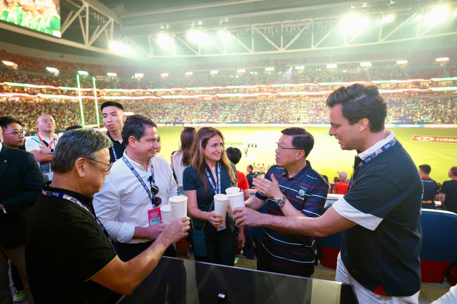 李家超在社交平台表示,賽事期間他與不同內地和外國企業代表聊天,他們都對香港的七人欖球賽讚不絕口,亦對香港未來的發展充滿信心。李家超指,香港作為世界各地企業的「超級增值人」,正好發揮國際大都會的重要橋樑角色,協助不同企業以毅力和拼勁為夢想「達陣」 ,走向國際。