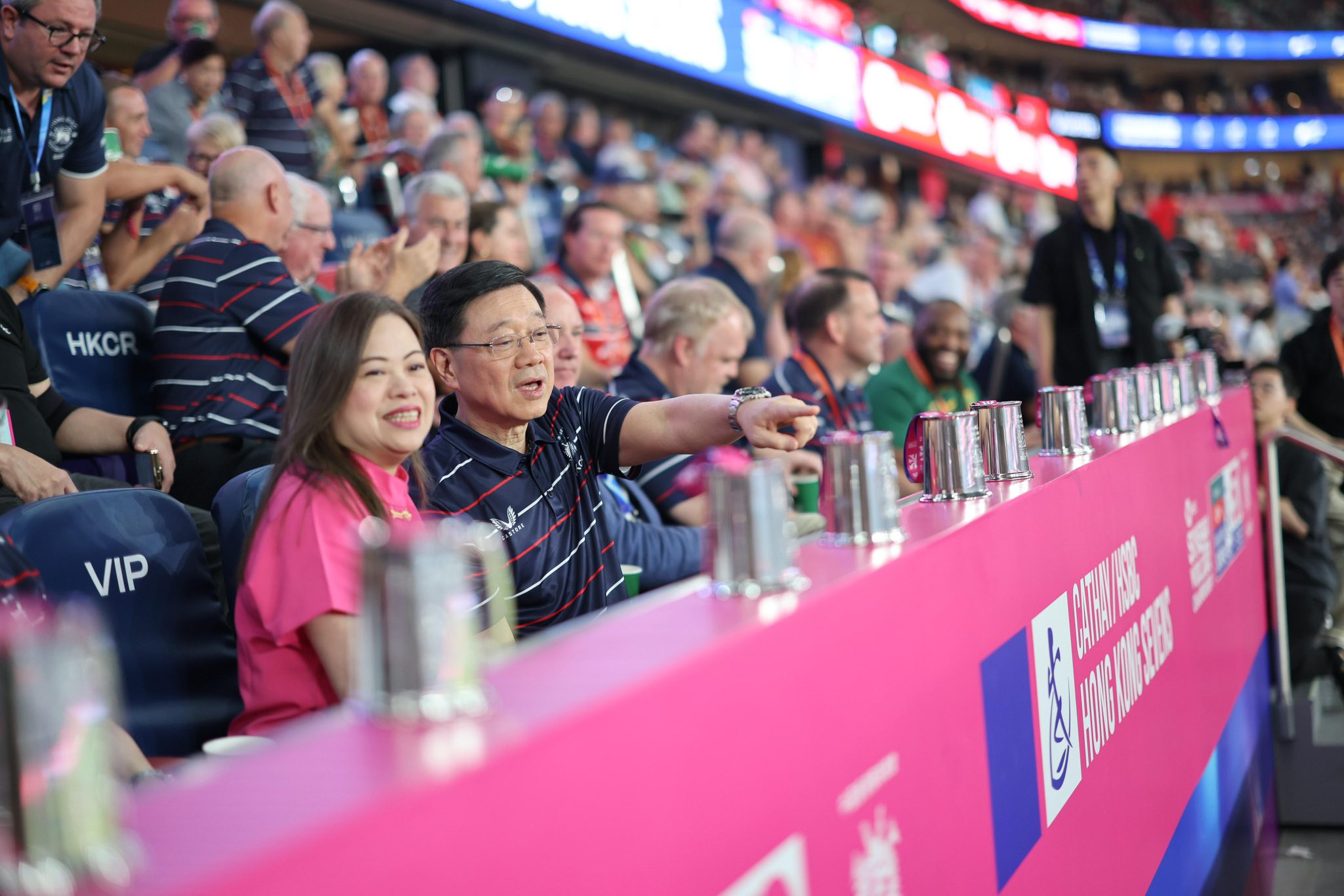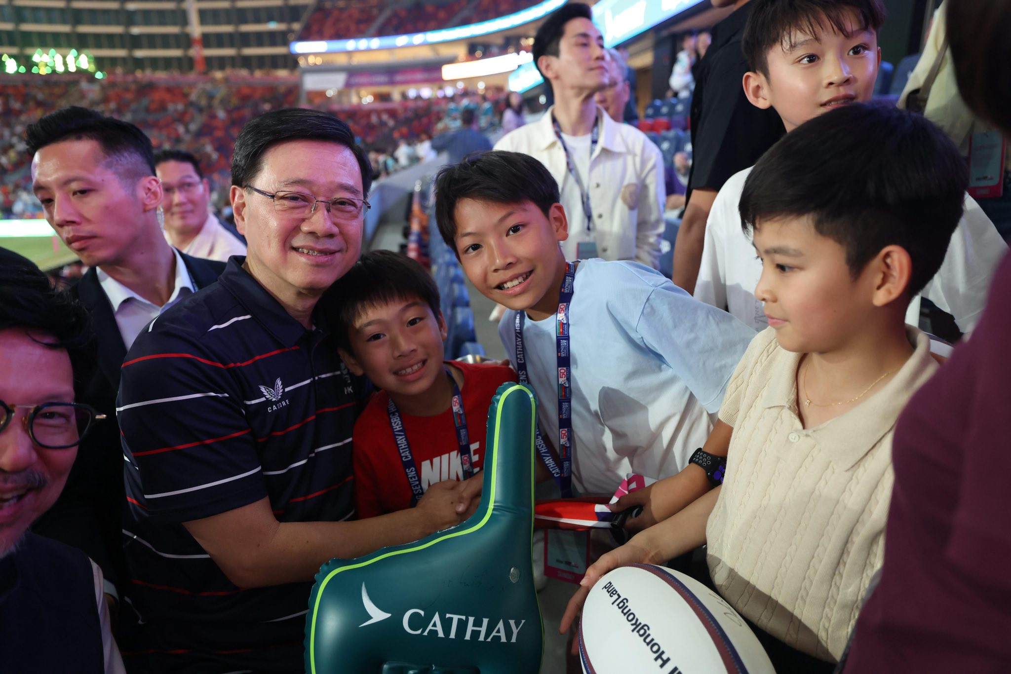 一連三日的香港國際七人欖球賽今晚(19日)結束,行政長官李家超到啟德體育園主場館觀賽,並於賽後頒獎。