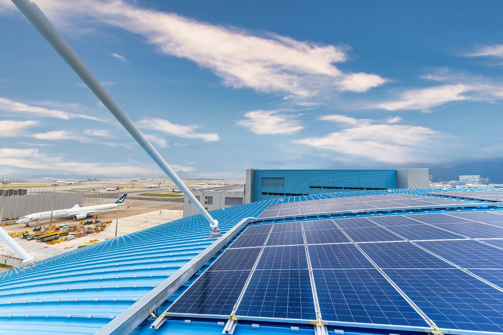 港機已於三個飛機庫天台安裝超過八千塊太陽能板。(相片由中電及港機提供)