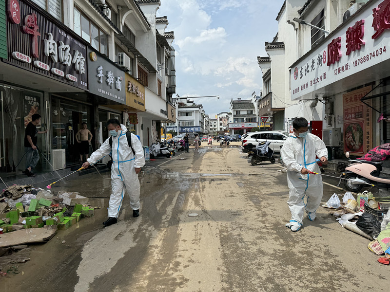 為防止洪水退後病媒生物孳生,歙縣衛健部門組織第三方消殺公司、救援隊及疾控專業人員,全方位對城內受災區域進行病媒消殺、環境消毒工作。「我們主要針對綠化帶、垃圾桶、農貿市場、下水道等病媒生物孳生場所進行消殺,快速滅蚊滅蠅。」現場消殺技術主管劉建偉告訴記者。