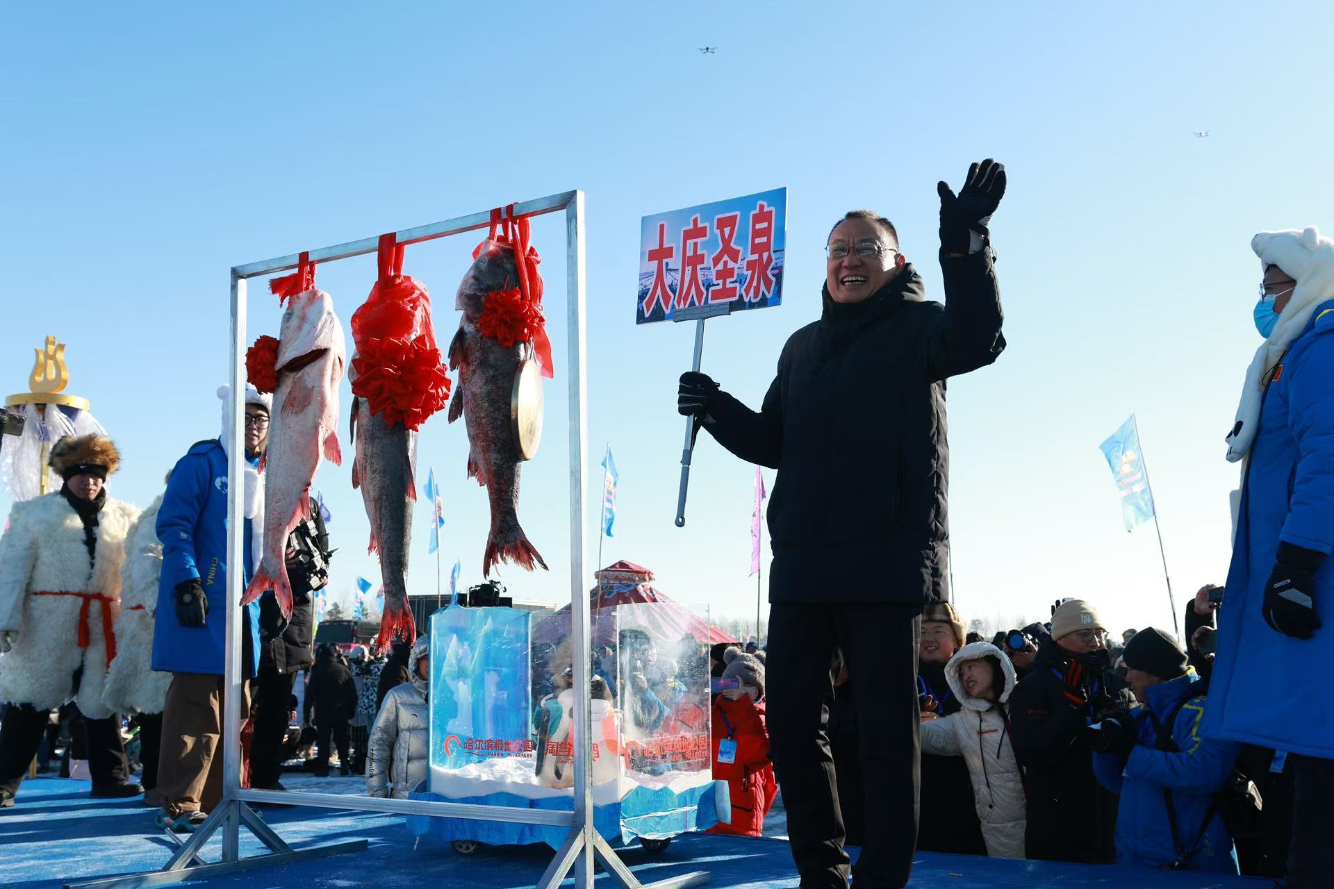 千年漁獵,生態漁業。12月27日,2024黑龍江「冷水魚·冬捕季」系列活動在大慶市杜爾伯特蒙古族自治縣連環湖畔盛大啟幕。當日最大單網出魚量約35萬斤左右,全縣當日總捕撈數量高達110萬斤,當天通過電商直播和線下銷售冬捕水產品70萬斤,銷售額1000萬元。整個冬捕季捕撈預計達到400萬斤,銷售總額預計達6000萬元。大慶聖泉綠色技術有限公司當日拍得頭魚288萬元。