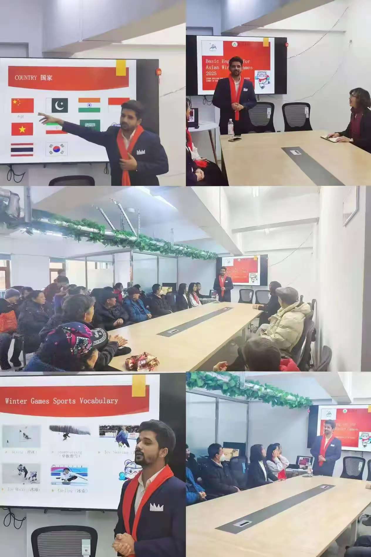 活動中,兩位留學生迅速化身為熱情洋溢的語言講師。他們巧妙地以日常生活場景為切入口,緊密結合《文明亞冬市民手冊》裏的實用日常交際內容,引領大家走進英語學習的趣味世界。「Hello, What can I do for you?」「你好,我能為您做些什麼?」 以及「Happy new year」「新年好」等常用口語表達,在輕鬆愉快的氛圍中被居民們反覆跟讀、熟練掌握。不僅如此,他們還精心教授各類冰雪運動項目的英文表達方式,以及亞冬會參賽國家的名稱。