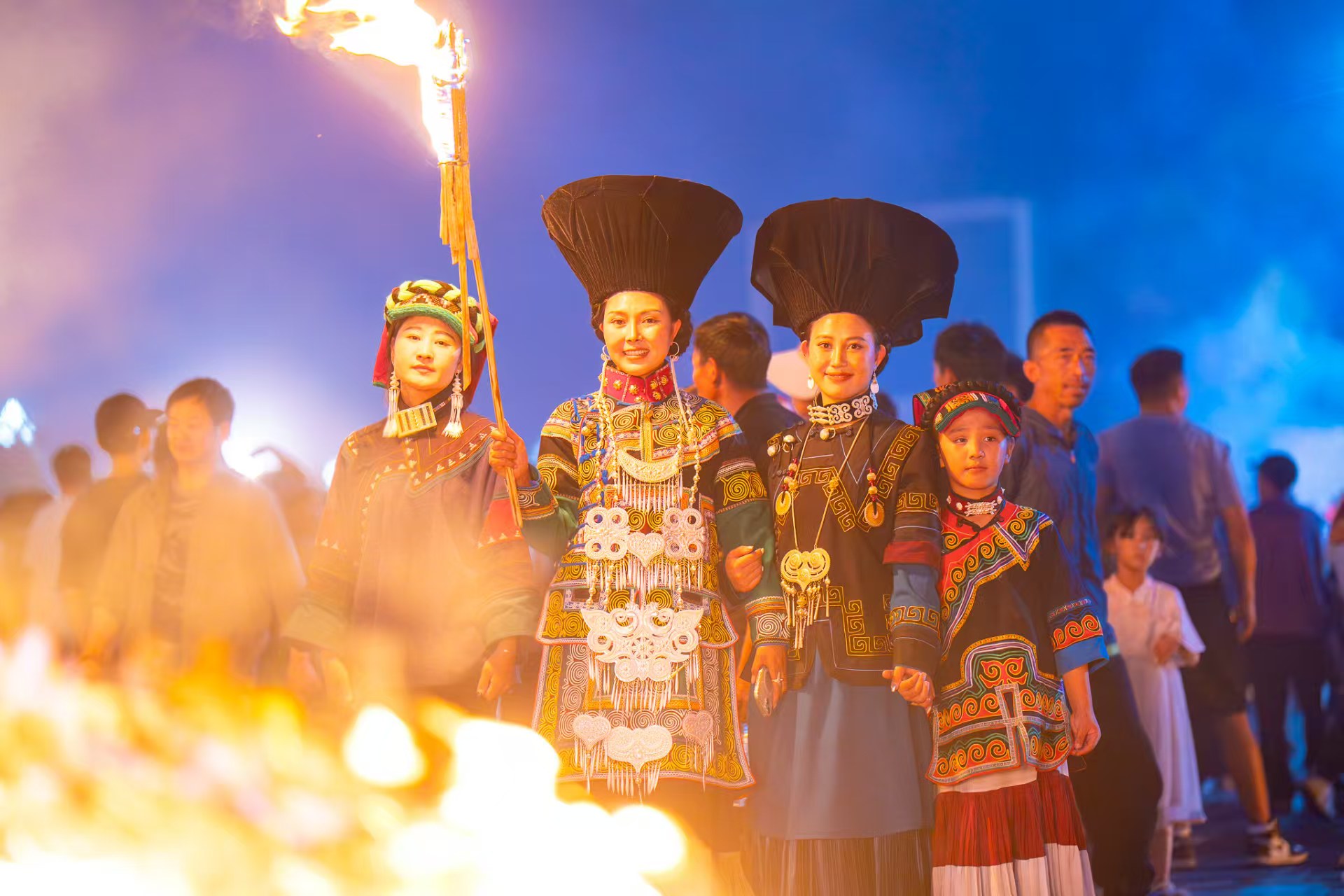 夜漸深,狂歡的氣氛達到了高潮,點火儀式開始,火把隨之點燃,進入篝火晚會,大家手拉手圍着火把打跳狂歡。