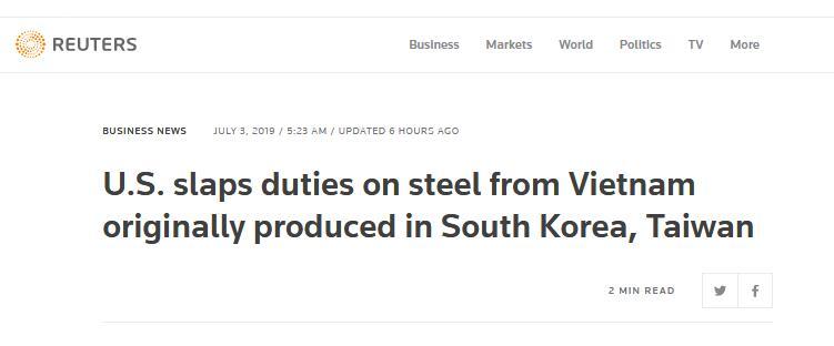 据路透社消息,当地时间2日,美国商务部宣布,将对部分来自台湾(地区)与韩国的钢铁制品征收最高456%的惩罚性关税。美国商务部通过声明介绍,这些钢铁制品在原产地生产后,被运到越南进行轻微加工,然后再出口美国,借此规避反倾销和反补贴关税。
