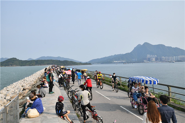 在船灣大美督,下午出現了郊遊人潮。淡水湖主壩擠滿遊人,單車穿梭往來,部分市民更除下口罩,享受大自然風光。