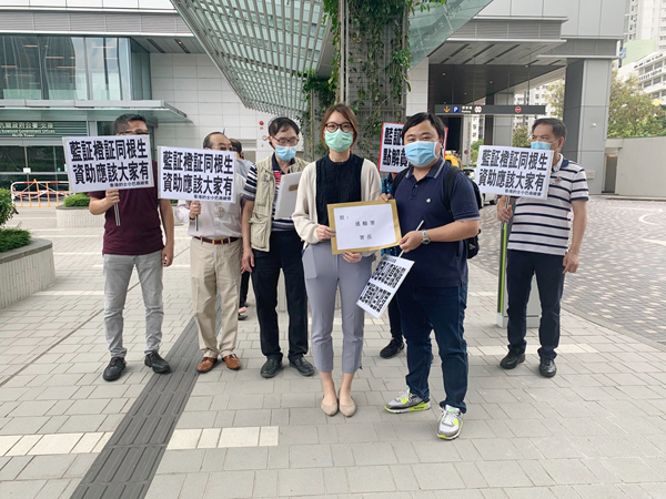 香港的士小巴商總會數名成員昨日到西九龍政府合署遞交請願信,又高叫口號「藍證橙證同根生、資助應該大家有」、「藍證司機有開工、點解資助冇佢份」等。他們指,就政府在「防疫抗疫基金2.0」中,援助的士司機津貼方案未有共識,但明白政府需要考慮各方利益達致公平。政府的初心希望是在疫情裏,幫助到正在水深火熱工作的司機,以及冒有機會被感染的風險精神,而藍證司機確實有開工,但資助卻沒有他們份。