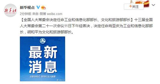 十三届全国人大常委会第二十一次会议11日下午经表决,决定任命肖亚庆为工业和信息化部部长,胡和平为文化和旅游部部长。