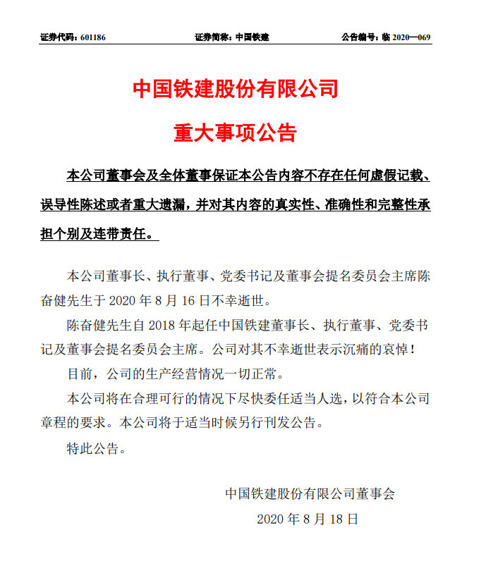中國鐵建8月18日早間發布公告,公司董事長、執行董事、黨委書記及董事會提名委員會主席陳奮健先生於2020年8月16日不幸逝世。