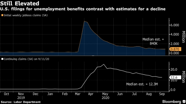 彭博社分析稱,申請失業救濟的美國人數量仍然居高不下,表明勞動力市場復甦艱難。在前一周的報告中,首次申請失業救濟人數有所下降,但本周數據再度上升,顯示一些企業加強招聘,另一些企業則在裁員,數據因此漲跌不一。由於企業在沒有政府額外刺激措施的情況下難以維持生計,數以百萬計的美國人仍然失業或面臨失業風險。