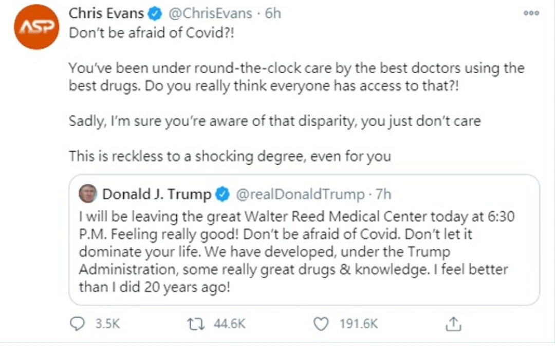 特朗普的發言引起曾出演「美國隊長」的演員基斯伊雲斯(Chris Evans)不滿,他在Twitter寫道:「不要害怕Covid?你有最好的醫生和最好的藥物,你真的以為所有人都能有同樣的待遇?很遺憾你對這事不是不知道,只是你一點也不在乎。」