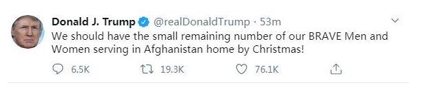 他写道:「我们应该让我们在阿富汗服役的剩下的一小部分勇敢的男女士兵们在圣诞节之前回家!」