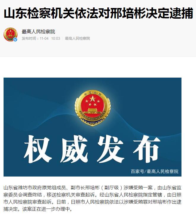 山東省濰坊市政府原黨組成員、副市長邢培彬(副廳級)涉嫌受賄一案,由山東省監察委員會調查終結,移送檢察機關審查起訴。經山東省人民檢察院指定管轄,由日照市人民檢察院審查起訴。日前,日照市人民檢察院依法以涉嫌受賄罪對邢培彬作出逮捕決定。該案正在進一步辦理中。