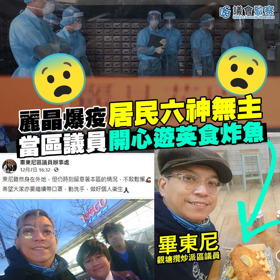 九龍灣麗晶花園疫情大爆發,不少住戶緊急撤離,隨後更被政府專家稱為「疫區」。然而,居民人心惶惶之際,麗晶區議員、公民黨區議員畢東尼卻在fb上大曬英國風景,甚至食炸魚薯條的相片。