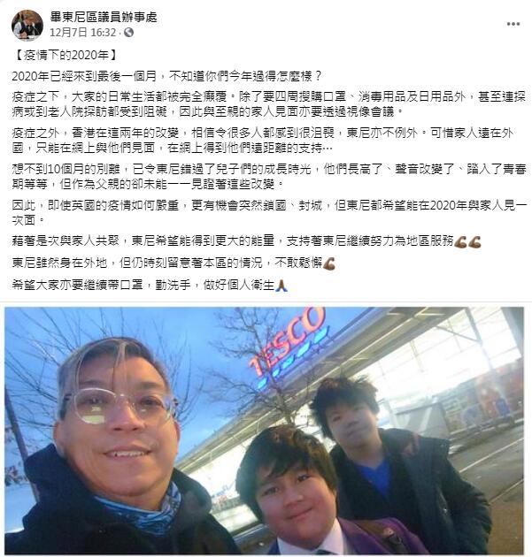 原來,畢東尼聲稱,「不到10個月的別離,已令東尼錯過了兒子們的成長時光」,故「即使英國的疫情如何嚴重,更有機會突然鎖國、封城,但東尼都希望能在2020年與家人見一次面」,因此畢東尼「恰好」於日前前往英國休假。