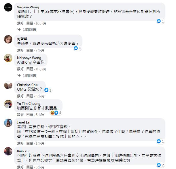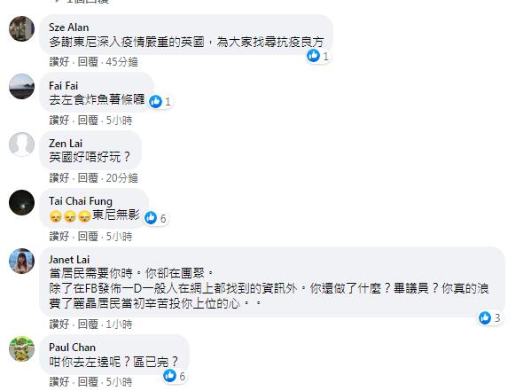 畢東尼聲稱,「雖然身在外地,但仍時刻留意著本區的情況,不敢鬆懈」,但卻有不少當區居民在其fb頁面留言,稱「畢議員,幾時返來幫街坊大廈消毒?」、「當居民需要你時。你卻在團聚」,更有網友暗諷其「深入疫情嚴重的英國,為大家找尋抗疫良方」。