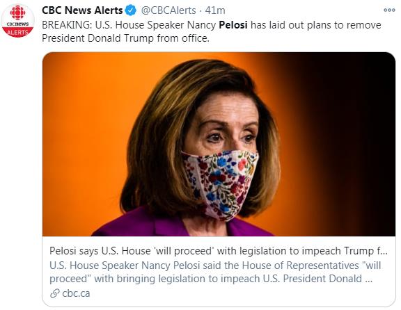 佩羅西在接受採訪時說:「眾議院強烈支持對總統發起第二次彈劾。」佩洛西還表示,她支持美國副總統彭斯援引第25條修正案,該修正案允許彭斯在彈劾前宣布特朗普無法履行其職責而將他免職。