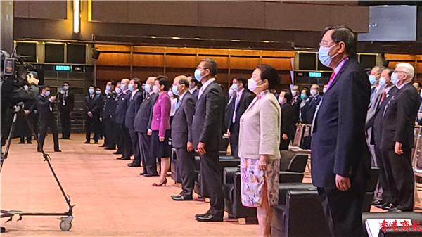 全國政協副主席董建華(左五),香港特區行政長官、香港特區維護國家安全委員會主席林鄭月娥(左六),中央人民政府駐香港特別行政區聯絡辦公室主任、香港特區維護國家安全委員會國家安全事務顧問駱惠寧(左四),中央人民政府駐香港特別行政區維護國家安全公署署長鄭雁雄(左三),中國外交部駐香港特別行政區特派員公署署理特派員楊義瑞(左二),中國人民解放軍駐香港部隊司令員陳道祥少將(左一)與特區政府三位司長、立法會主席和行政會議召集人合影。中新社