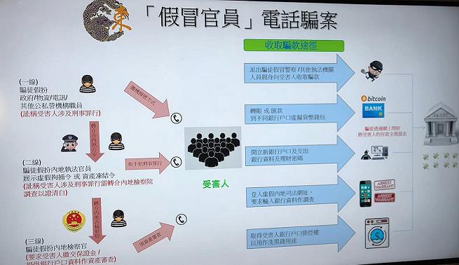 被捕11人全部為本港居民,當中5人有刑事案底。第1名被捕人涉及去年6月4日至本年3月15日共7宗「假冒官員」騙案,7名受害人收電話後,賊人以所謂「特務」身份登門收錢,或押解受害人到銀行開設網上理財戶口,以騙取金錢。在警誡下有人承認以「特務」身份騙取事主,但同時辯稱自己是電騙受害者,曾在去年4月被騙,警方搜查其寓所時,檢獲他犯案時所穿衣物、假冒的公安拘捕令和紀錄如何行騙事主的記事冊。